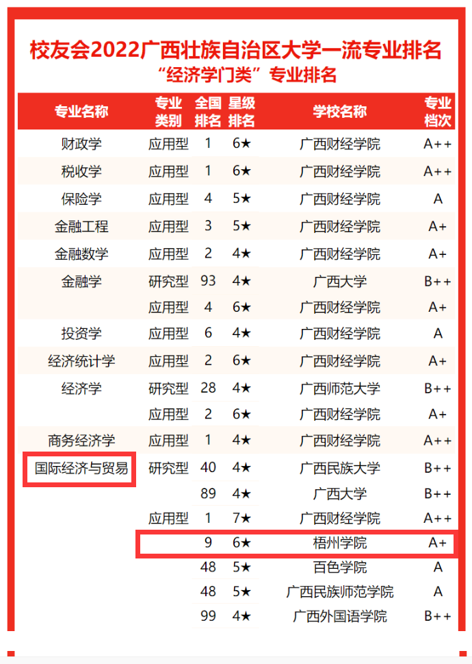 2022年3月30日,全国第三方大学评价机构艾瑞深校友会网撰写、科学出版社出版发行的《2022校友会中国大学排名--高考填报志愿指南》发布了2022中国大学一流专业排名榜单。必赢官网的国际经济与贸易专业(应用型)在广西壮族自治区大学一流专业排名中,专业档次A+。