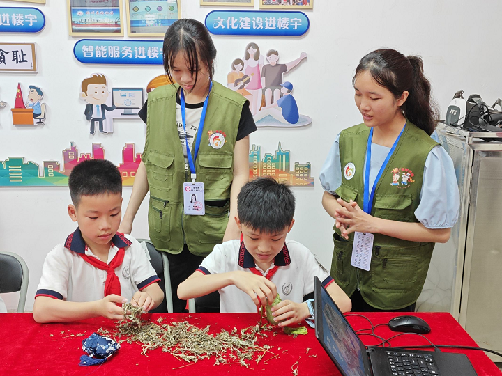 活动现场气氛活跃,志愿者带领小朋友们观看动画小短片、制作简易香囊、朗颂诗歌。志愿者们还认真为小朋友们讲解清明习俗。小朋友们也积极参与到活动中。