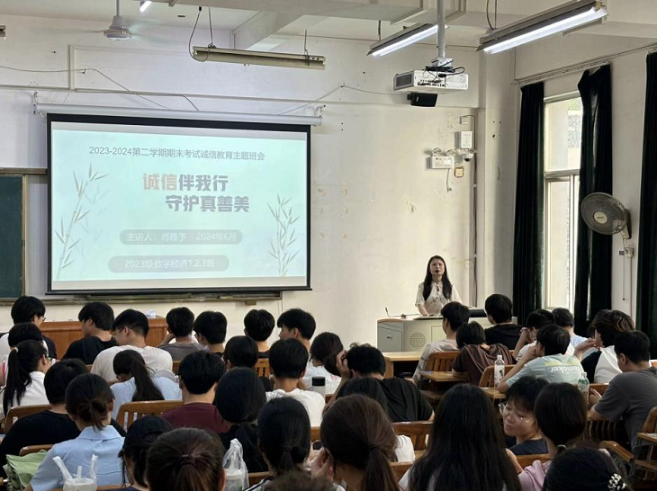 6月21日下午,2023级数字经济1、2、3班在明理楼S204召开以“诚信伴我行,守护真善美”为主题的诚信教育班会。此次会议由辅导员肖雅予主持,2023级数字经济1、2、3班全体学生参加会议。